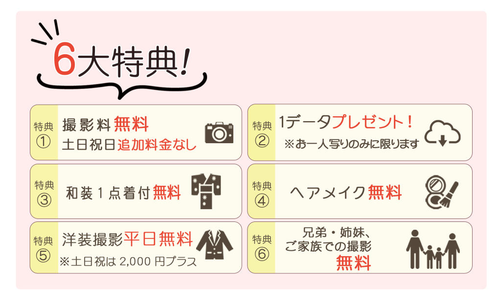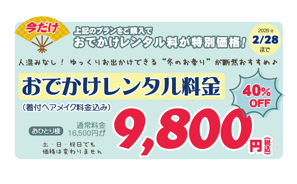 Date 2026.01.09 キャンペーン New! 七五三 後撮りキャンペーン 2026✨ 七五三、今からでも間に合います。撮りそびれた方も、ゆっくり残したい方も。1月~2月末限定《七五三後撮りキャンペーン》 和装プラン おひとり様 3,000円(税込) 充実の「6大特典」が含まれた基本プランです。 🎉お得なセットプランをご用意しました🎉 さらに!今だけ限定!おでかけレンタル特別価格 人混みなし!ゆっくりお出かけできる“冬のお参り”が断然おすすめ♪ ご予約やご相談はもちろん、ご不明な点がございましたら、お電話・LINEからお気軽にお問い合わせください。